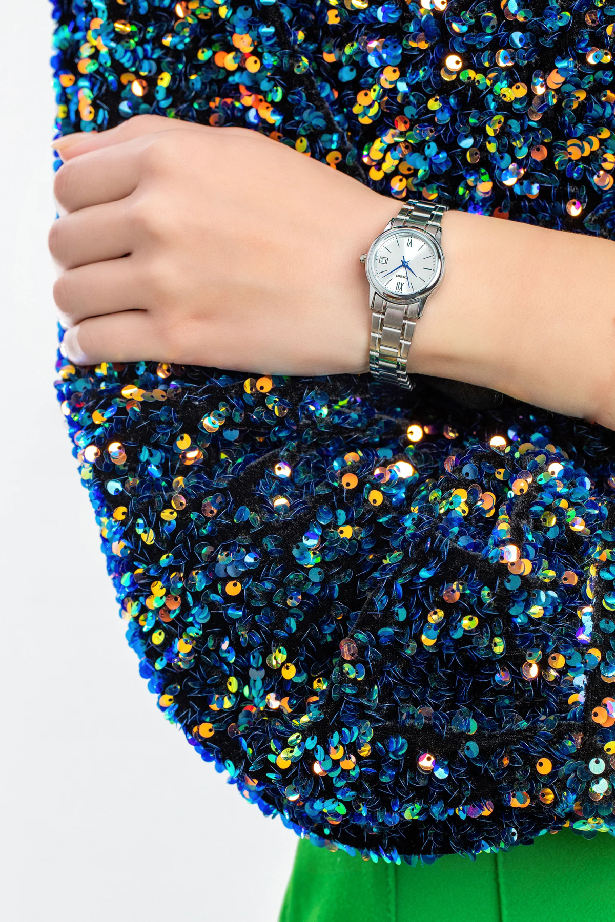 This model features an easy-to-read silver dial, which contrasts with black indexes and hands for convenient time reading. The watch has a date function, and its WR30 water resistance protects against accidental splashes, making it a practical choice for everyday use.