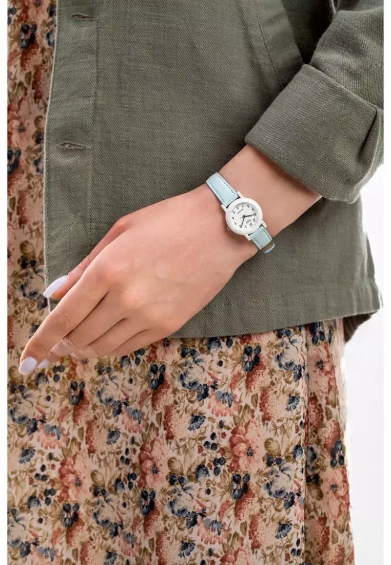 Ten model zachwyca niebieskim, skórzanym paskiem, który jest lekki, miękki i doskonale dopasowuje się do dziecięcej ręki. Biała koperta dodaje zegarkowi subtelnego blasku, a czytelna tarcza z dużymi cyframi sprawia, że odczyt czasu jest niezwykle prosty i intuicyjny. To połączenie uroczego designu z praktycznością, które przypadnie do gustu każdej młodej fance mody.