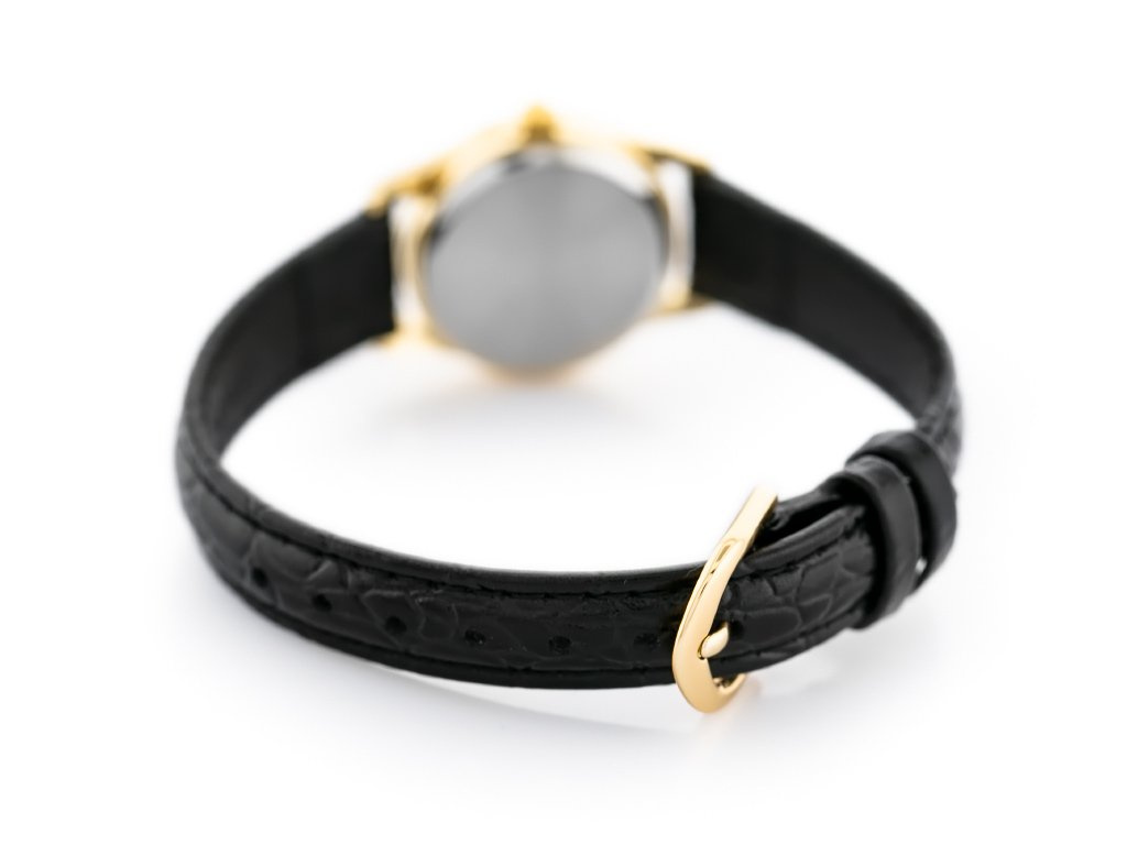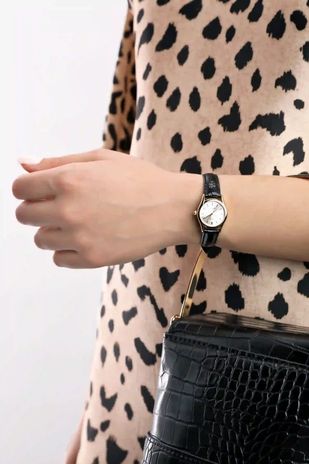 Koperta zegarka wykonana z wysokiej jakości stali szlachetnej w klasycznym, złotym kolorze nadaje mu wyrafinowanego charakteru. Zastosowanie materiałów odpornych na uszkodzenia gwarantuje, że zegarek będzie wyglądał jak nowy przez długi czas, niezależnie od intensywności użytkowania. Tarcza w odcieniu złotym i smukłe indeksy zapewniają doskonałą czytelność godziny, a jej minimalistyczny design dodaje całości elegancji i lekkości.