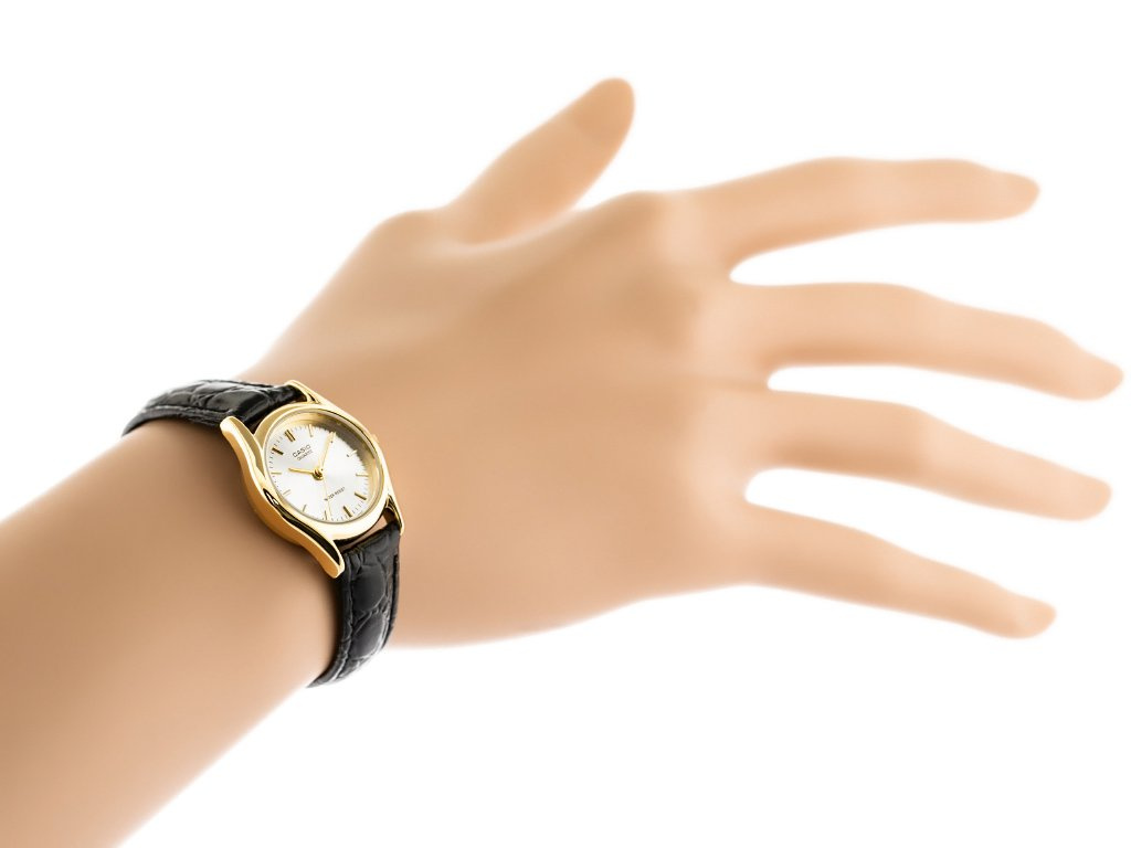 Zegarek Casio LTP-1094Q-7B2RDF wyposażony jest w wysokiej jakości pasek wykonany z trwałej skóry, które doskonale komponuje się z całością. Jego wygodna konstrukcja sprawia, że zegarek jest komfortowy w noszeniu, a precyzyjne wykończenie dodaje mu subtelnego uroku. Jest to model, który dzięki swojej lekkiej i zgrabnej budowie świetnie pasuje na nadgarstek każdej kobiety, zapewniając pełną swobodę podczas noszenia.