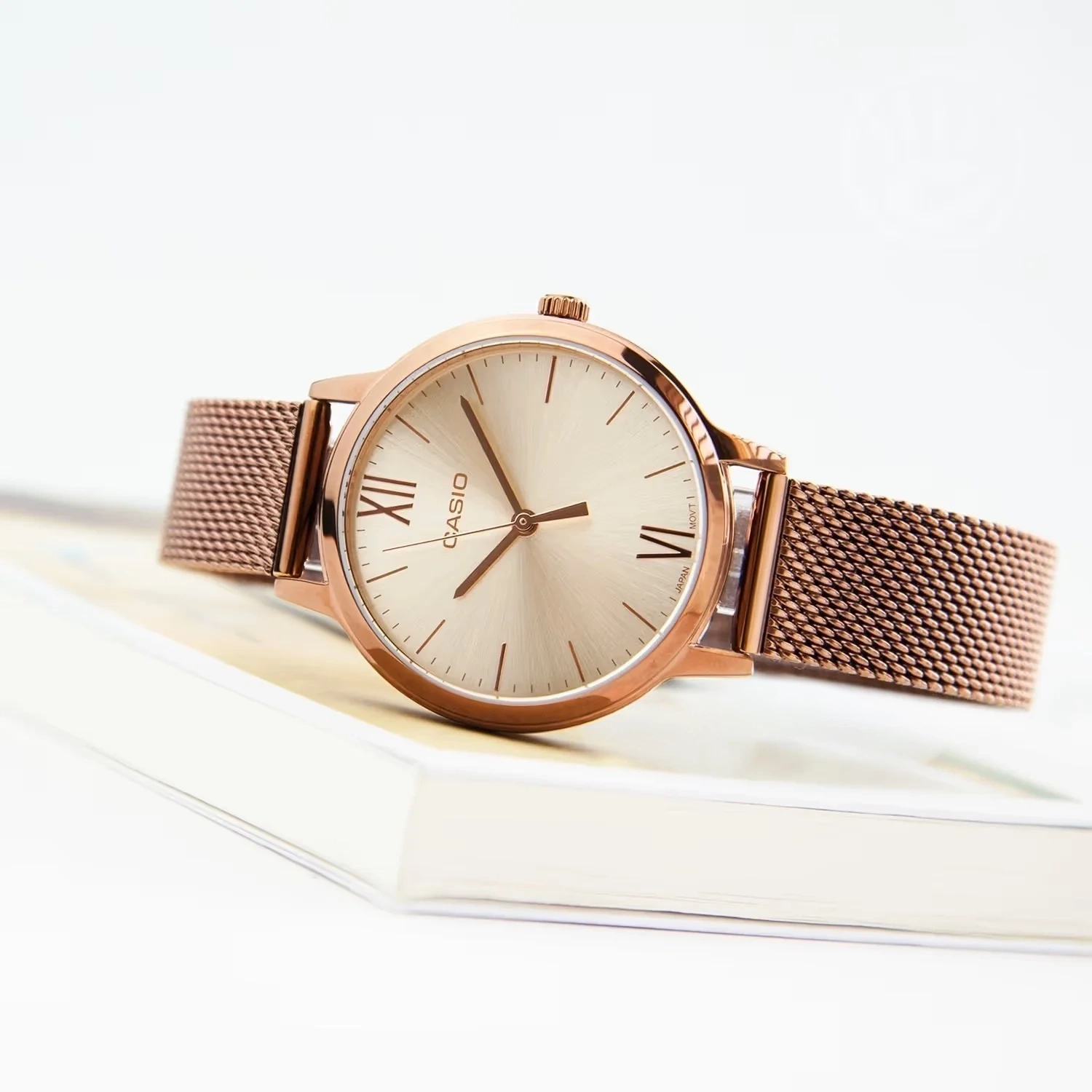 Zegarek CASIO LTP-E157MR-9AEF wyróżnia się elegancją okrągłej brązowj koperty i minimalistycznym designem. Jego niezawodność oparta jest na precyzyjnym japońskim mechanizmie kwarcowym, cenionym w świecie zegarmistrzowskim za doskonałą dokładność.