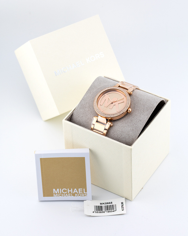 Michael Kors Parker MK5865 watch is a very glamorous and feminine accessory for both sporty and casual looks. The dial with a large MK logo and the envelope decorated with crystals. The envelope and bracelet are made of stainless steel in rose gold color. Mineral glass used. The watch has a waterproof rating of 50 meters, which means that it is resistant to minor splashes.