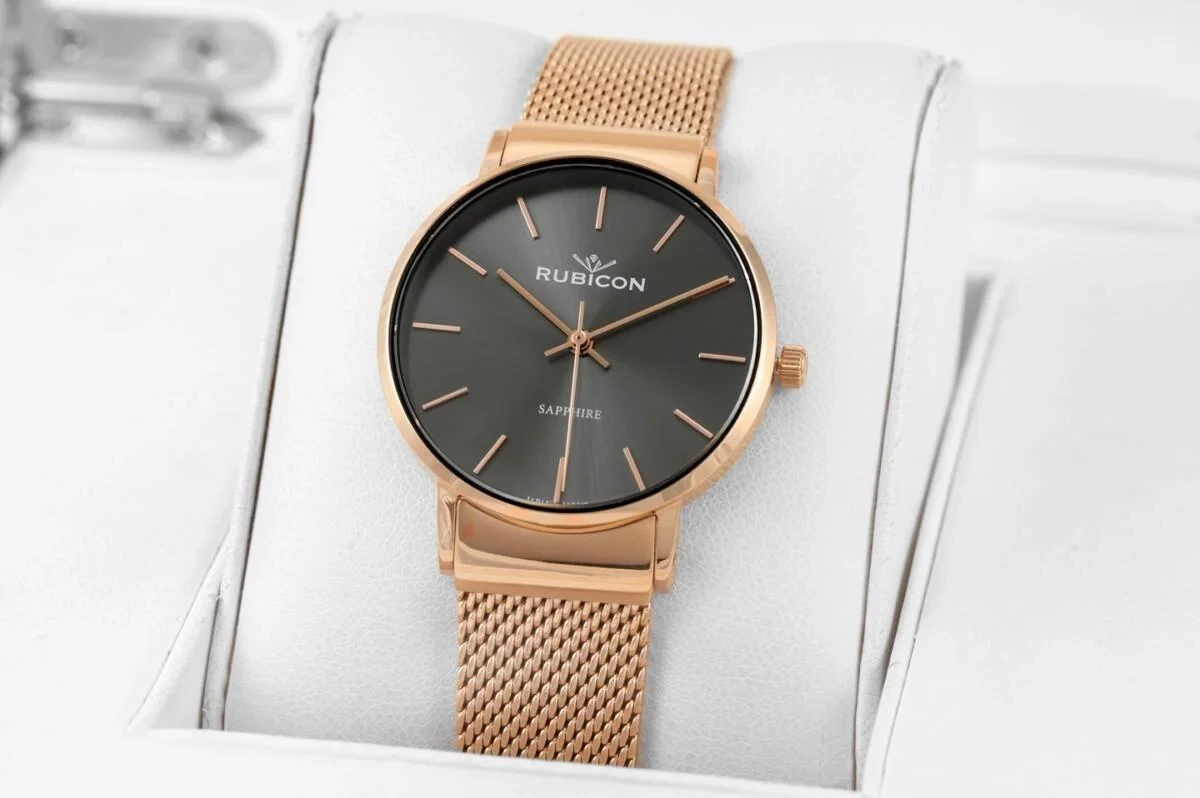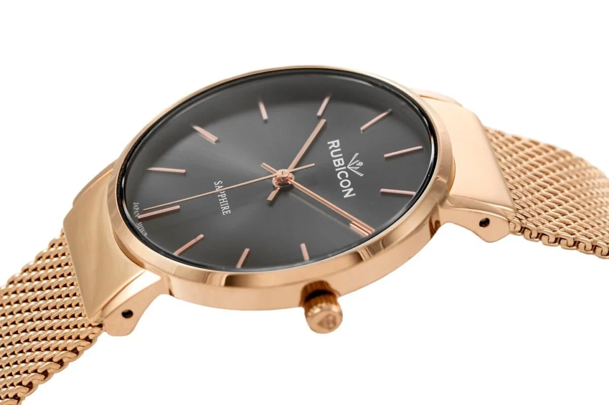 This unique Rubicon women's watch has gained recognition among many female timepiece lovers. Its elegant steel meshband bracelet gives it a fashionable look and blends perfectly with any outfit.Since 1998, the Rubicon brand has been a symbol of excellent design and exceptional quality in the world of watches. Each model combines not only beauty and style, but also the reliability of the mechanism, which is worthy of exclusive Swiss watches.The offer of the Rubicon brand is rich and varied, and includes both classic watches, maintained in traditional design, and those with refined aesthetics, which will perfectly emphasize the subtlety and exceptional taste of their owner. For men, Rubicon offers watches with modern and sometimes even innovative design, providing high functionality. Let this Rubicon watch become not only a practical tool for measuring time, but also a clear accent of your style and taste.