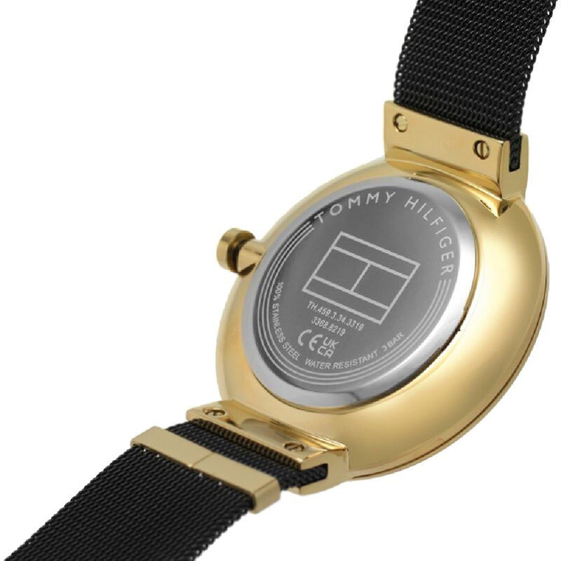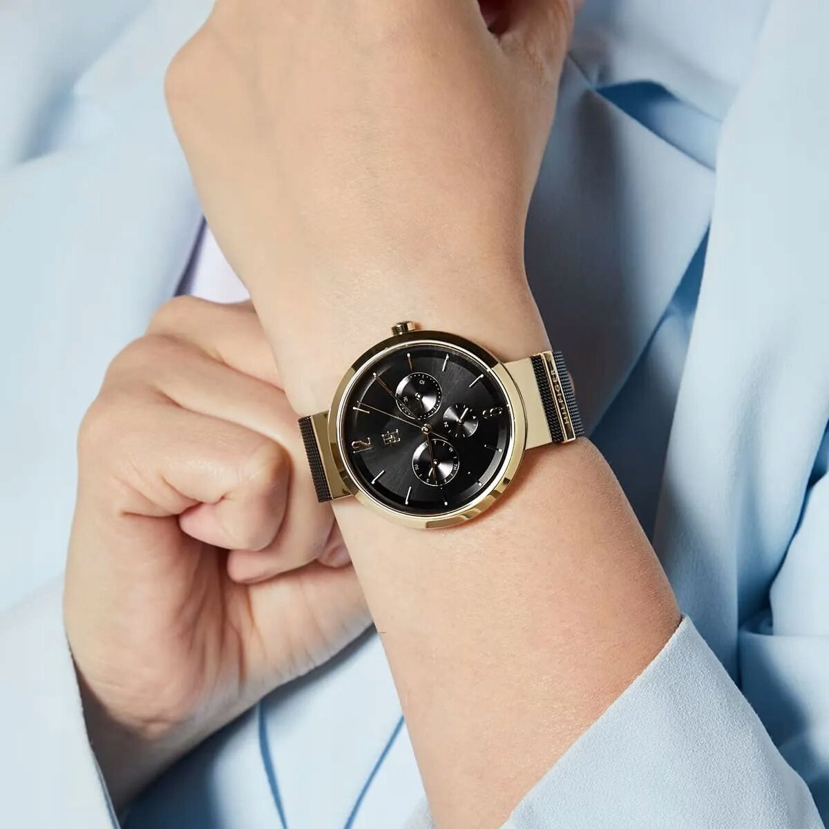 Tommy Hilfiger 1782540 LIDIA watch is an elegant women's timepiece powered by a reliable quartz movement. The envelope and bracelet are made of stainless steel, which guarantees its long-lasting resistance to damage in black and gold. The whole is complemented by a legible black dial.