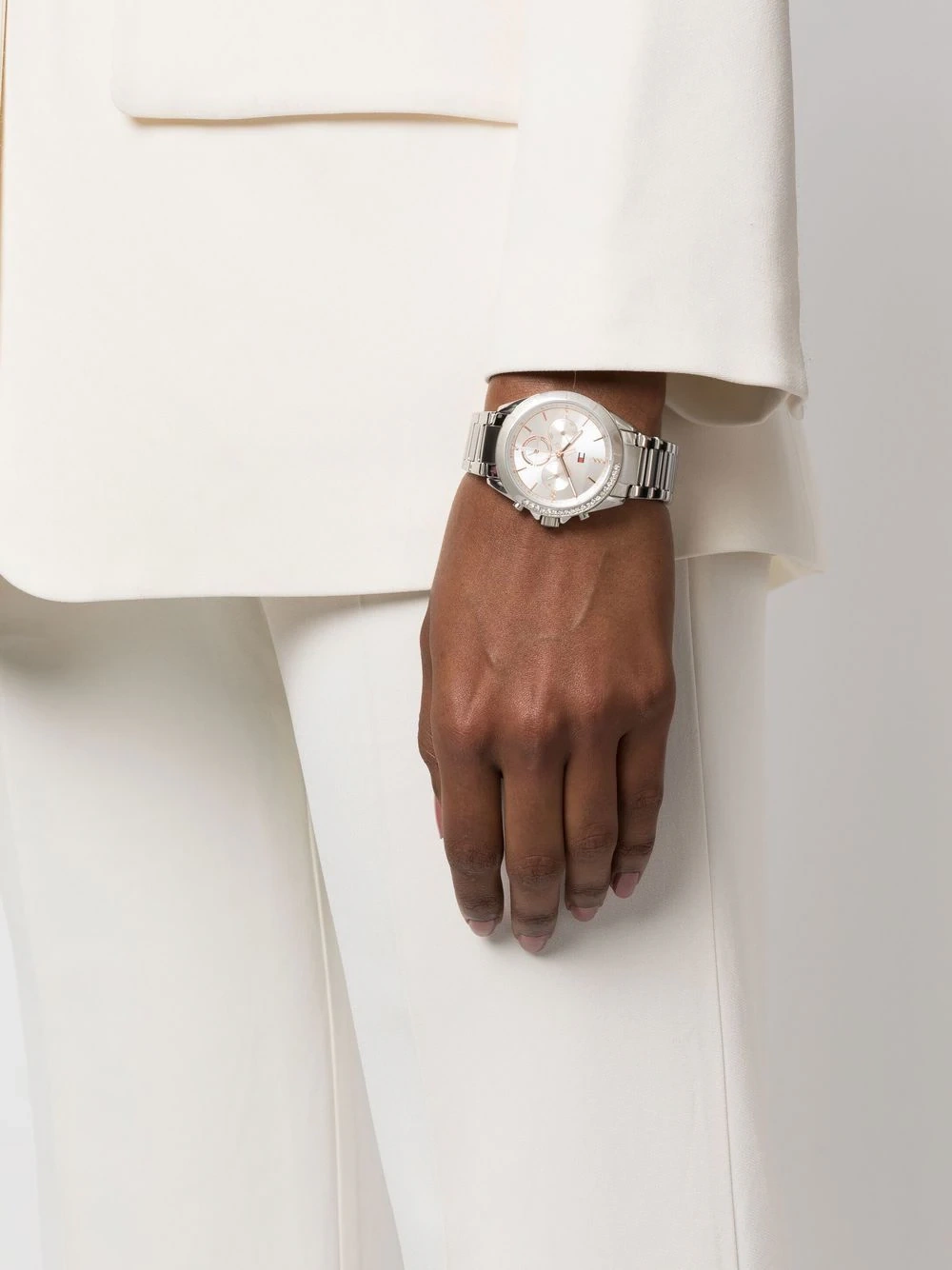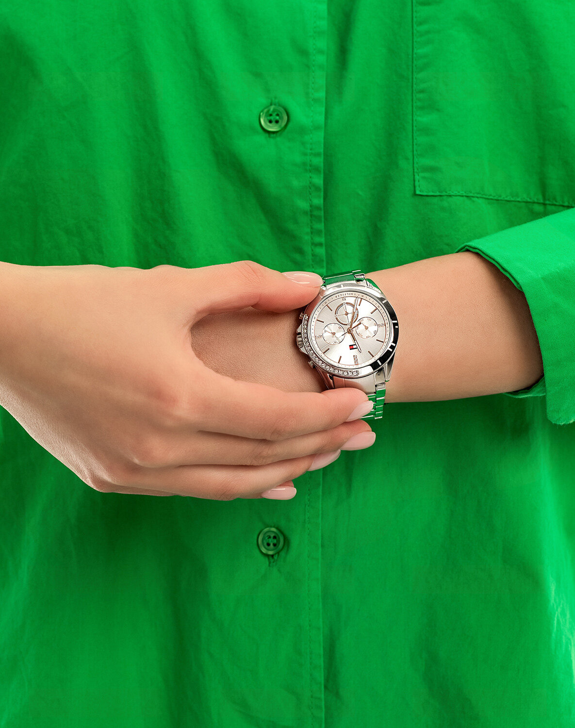 The Tommy Hilfiger Kennedy 1782384 watch is a unique offering from the iconic brand, reflecting the hottest trends. This elegant ladies' timepiece is powered by a reliable quartz movement. The envelope and bracelet are made of stainless steel, which guarantees its long-term resistance to damage. The whole is kept in silver color, the contrasting element is a silver dial decorated with a sunburst cut, which gives a modern industrial character. In addition, this model is not only pretty but also functional, with three sub-dials: days of the week, days of the month and 24H time. Water resistance of 5 ATM, guarantees protection even when swimming.