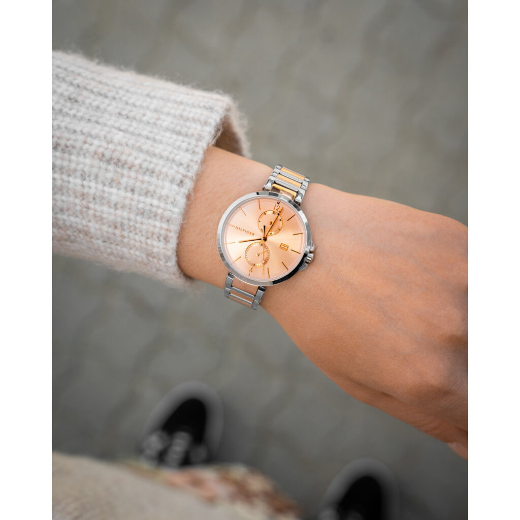 Women's Tommy Hilfiger 1782127 watch is an elegant timepiece protected by scratch-resistant mineral glass. The bracelet and the envelope are made of high-quality stainless steel in shades of silver and rose gold.