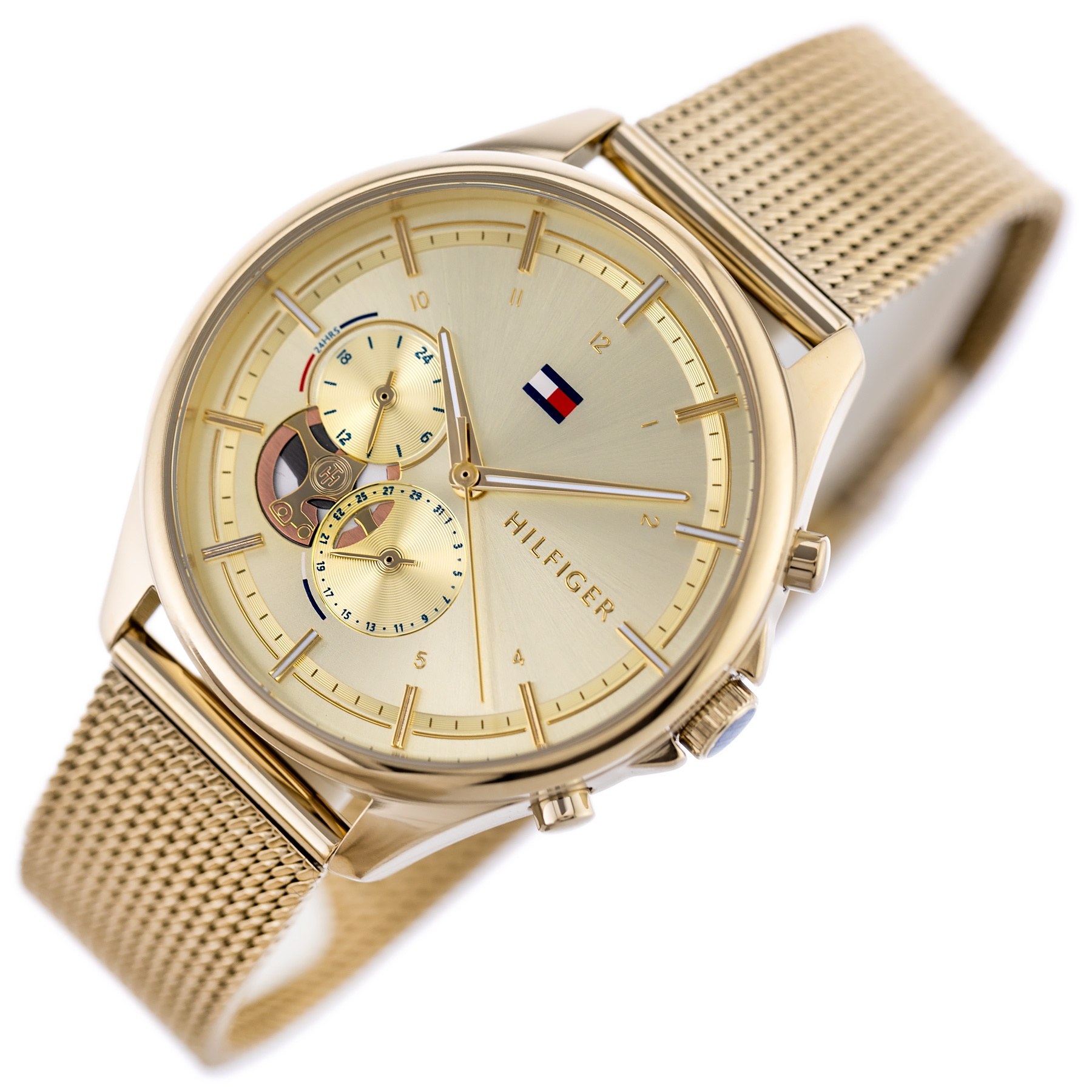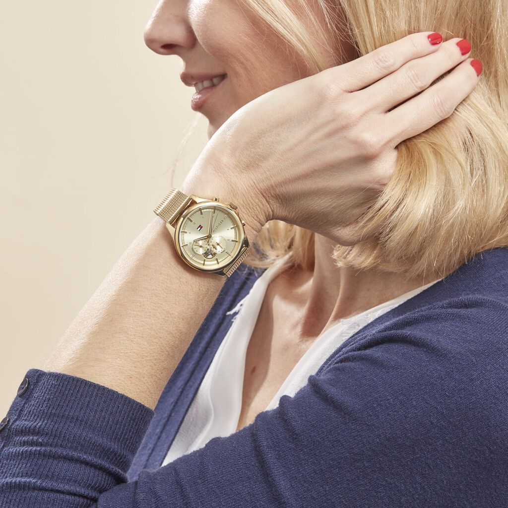 The Tommy Hilfiger 1782417 Quinn women's watch is an elegant and feminine choice for discerning ladies. It features a stainless steel envelope and bracelet in a subtle gold color, which give it a classic touch. The dial, also in a shade of gold and covered with mineral glass, exudes elegance and subtlety. In addition, the timepiece is equipped with a 24-hour dial and a functional date pad, which adds to its practicality. The model features a water resistance of 3ATM, which allows safe use in everyday conditions. The buckle clasp ensures the comfort and security of wearing the watch throughout the day.