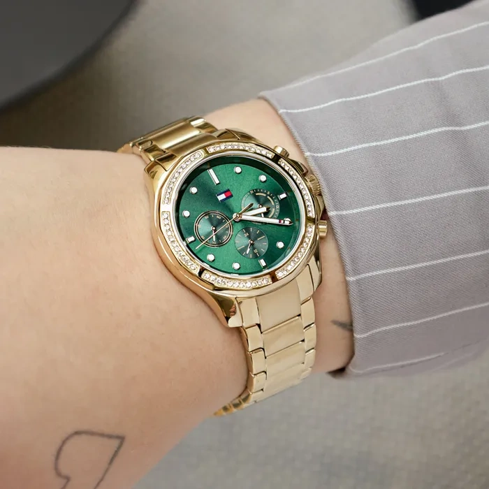 The Tommy Hilfiger Brooklyn 1782614 watch is a unique offering from the iconic brand, reflecting the hottest trends. This elegant women's timepiece is powered by a reliable quartz movement. The envelope and bracelet are made of stainless steel, which guarantees its long-lasting resistance to damage. The whole is kept in gold color, an additional advantage is the green dial decorated with a sunburst cut, which gives a modern industrial character. In addition, this model is not only pretty but also functional, with three sub-dials: days of the week, days of the month and 24H time. Water resistance of 5 ATM, guarantees protection even when swimming.
