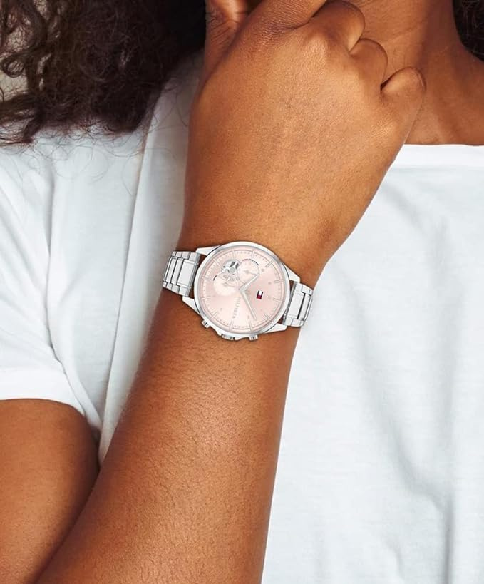 Zegarek damski Tommy Hilfiger 1782414 Quinn to elegancka i kobieca propozycja dla wymagających pań. Posiada kopertę oraz bransoletę ze stali szlachetnej w subtelnym srebrnym kolorze, które nadają mu klasycznego charakteru. Tarcza w delikatnym odcieniu różu, pokryta szkłem mineralnym, emanuje elegancją i subtelnością. Dodatkowo zegarek wyposażono w 24-godzinną tarczę oraz funkcjonalny datownik, co zwiększa jego praktyczność. Model charakteryzuje się wodoszczelnością 3ATM, co pozwala na bezpieczne użytkowanie w codziennych warunkach. Zapięcie klamrowe zapewnia komfort i pewność noszenia zegarka przez cały dzień.