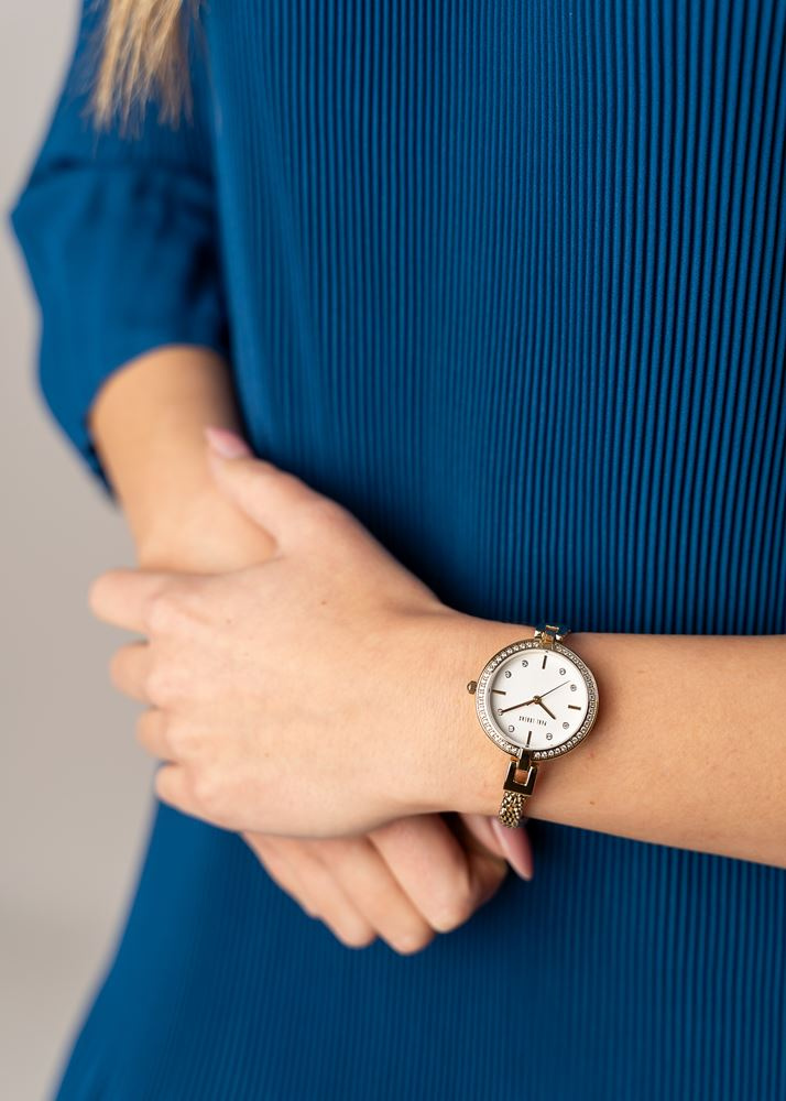 A women's gift set that impresses with its elegance, delicacy and timeless style. It includes a stainless steel watch by Paul Lorens in gold, with a beautiful white dial that subtly emphasizes its classic character. The watch's golden envelope, decorated with sparkling cubic zirconias, adds a unique touch of glamour. The watch also features WR30 water resistance, which makes it practical and functional. The set comes with a feminine gold-colored bracelet, which perfectly matches the watch. It is an ideal choice for a gift - elegant, beautiful and unforgettable.