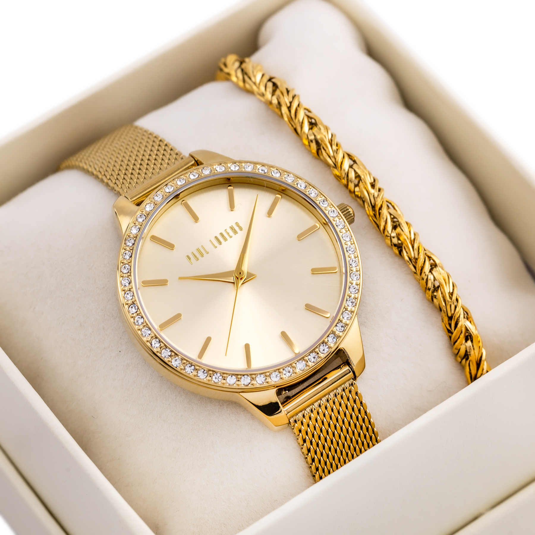 A women's gift set that impresses with its elegance and timeless style. It includes a gold-colored stainless steel watch by Paul Lorens, with a beautiful silver-colored dial that subtly emphasizes its classic character. The watch's golden envelope, decorated with sparkling cubic zirconias, adds a unique touch of glamour. The watch also features WR30 water resistance, which makes it practical and functional. The set comes with an elegant braided bracelet in gold, which perfectly matches the watch. It is the perfect choice for a gift - elegant, beautiful and unforgettable.