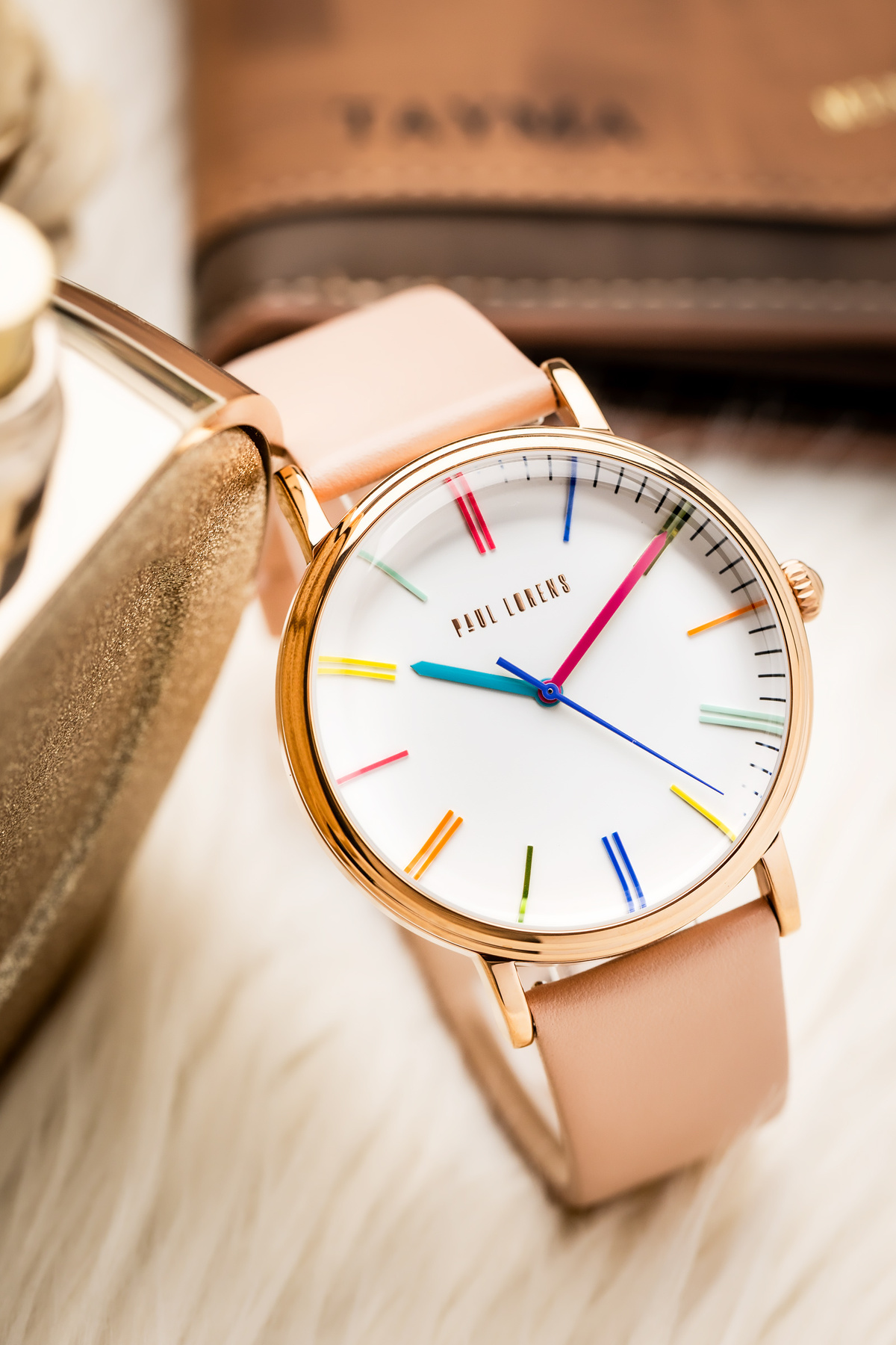 Zegarek wyróżnia się ponadczasową, różową kolorystyką i został wykonany z wysokiej jakości stali szlachetnej. Jego skórzany, delikatny pasek idealnie współgra z okrągłą, metalową kopertą, na której umieszczona została starannie zaprojektowana tarcza. Wskazówki w tym modelu są kolorowe i delikatne, nadając całości lekkości. Cyferblat jest chroniony przez szkło mineralne, które zapewnia odporność na zarysowania i uszkodzenia.