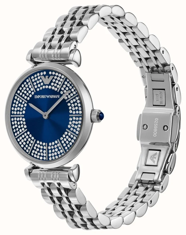 Women's Emporio Armani AR11627 watch from the Gianni T-Bar series is an elegant women's watch perfect for any occasion. The envelope and bracelet are made of stainless steel, which guarantees long-lasting resistance to damage. The model features an accurate battery-powered quartz movement. The dark blue dial decorated with zircons is protected by scratch-resistant mineral glass.