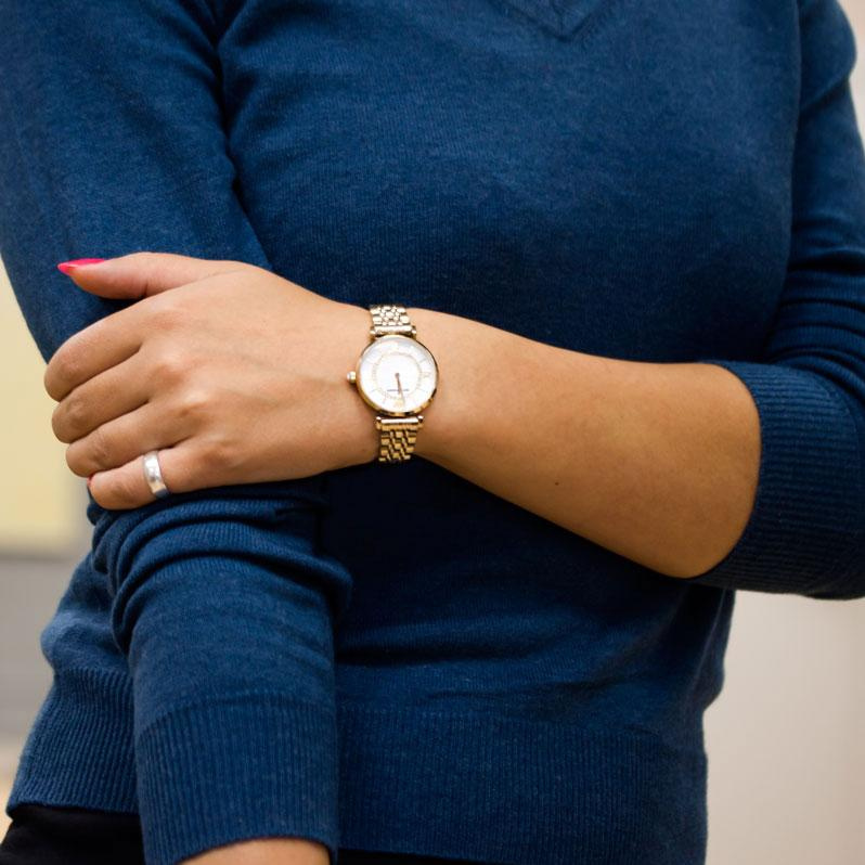 The bracelet and the envelope are made of high-quality stainless steel in gold color. The water resistance class of the timepiece is WR30, which guarantees the watch's watertightness in case of minor splashes.