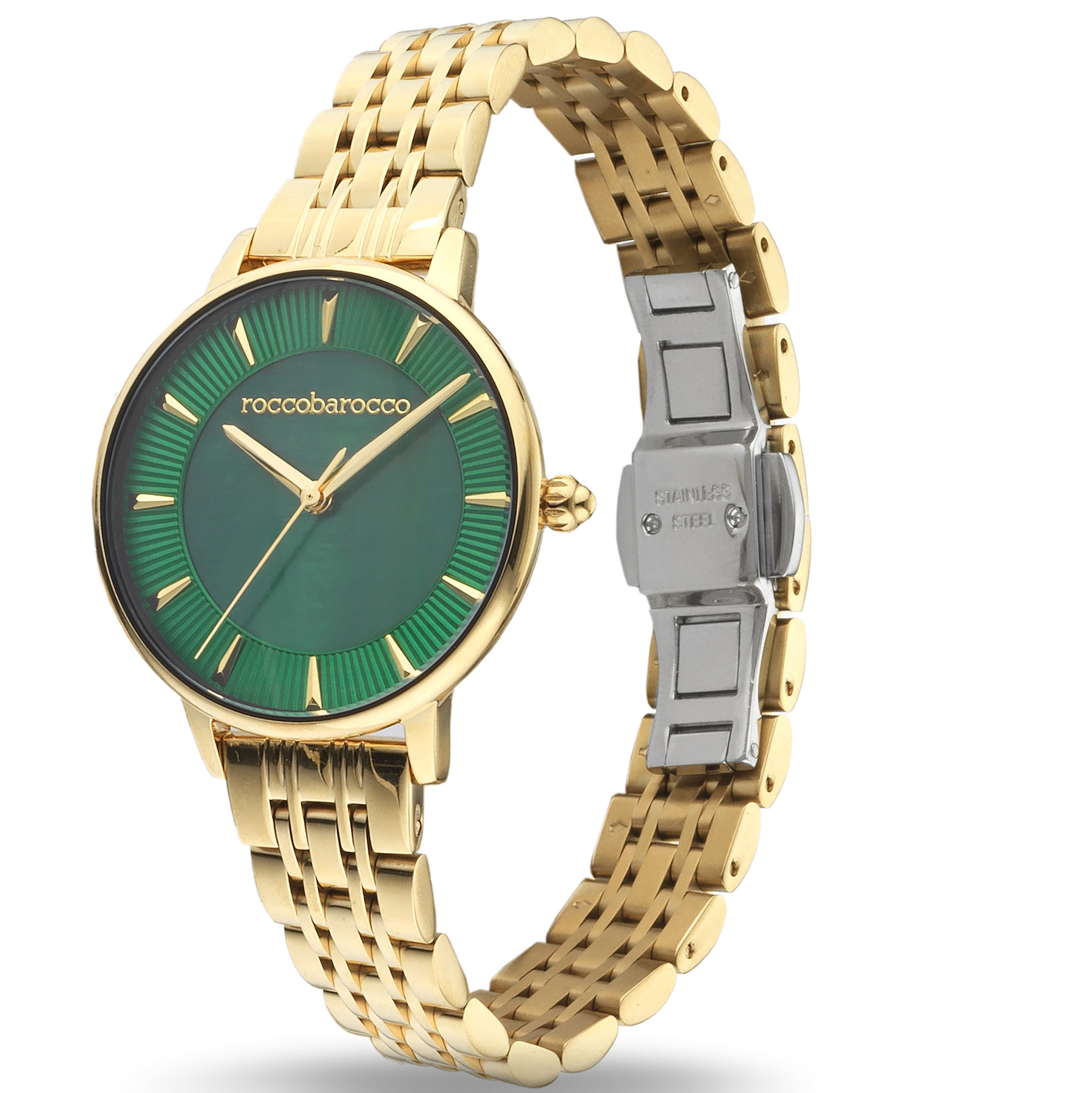 RoccoBarocco BOXSET RB.4659L-04M women's watch is designed for women who appreciate delicate accessories. The beautiful RoccoBarocco RB.4659L-04M set in gold with a bracelet of the same color and a green dial, will surely appeal to every woman. The RoccoBarocco RB.4659L-04M watch is equipped with a precise quartz movement.