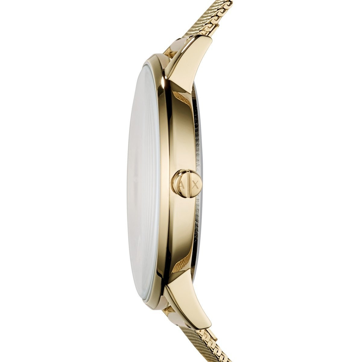 Armani Exchange to pełnoprawna marka stworzona przez znanego na całym świecie projektanta Giorgio Armaniego, zachowując tą samą jakość i prestiż,co jej bliźniacza marka Emporio Armani czy Armani Jeans. Również zasila sektor dóbr luksusowych. W tym przypadku jednak wśród odbiorców są głównie osoby młode. Zegarek Armani Exchange AX5536 swój modny design zawdzięcza rewelacyjnemu połączeniu koperty w kolorze złotym, z bransoletą typu mesh i złotą tarczą. Ten damski model znakomicie sprawdzi się jako modny dodatek na nadgarstku każdej nowoczesnej kobiety. Jak wszystkie zegarki AX w niesamowity sposób łączy w sobie markowy design, najmodniejsze trendy oraz ponadczasową, wyrafinowaną elegancję.