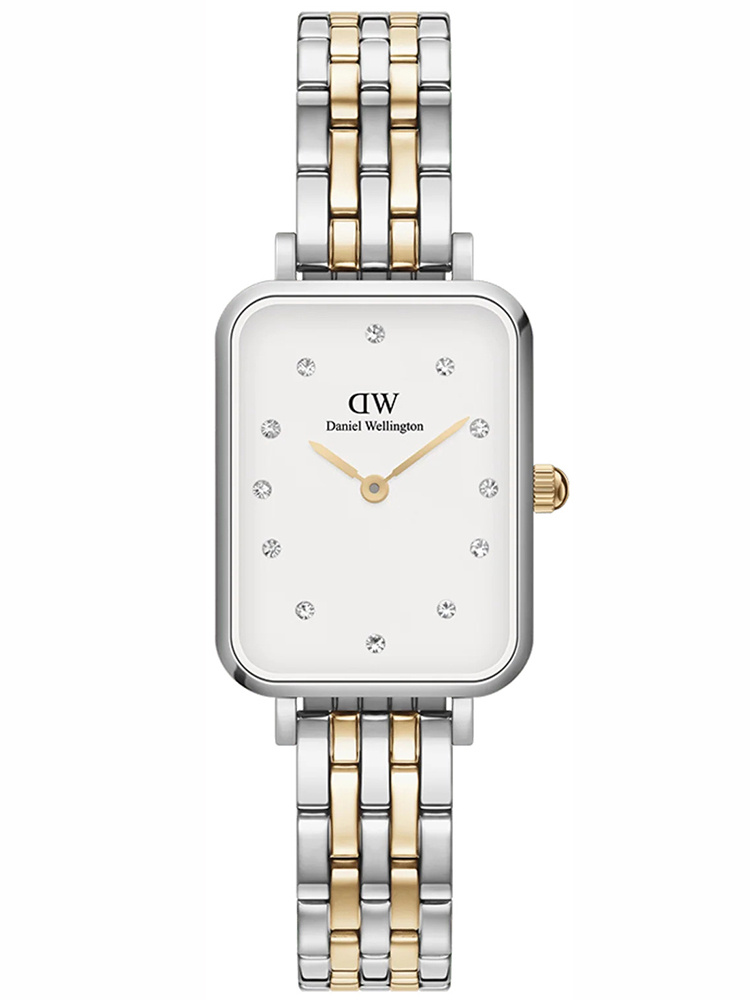 Zegarek damski Daniel Wellington Quadro Lumine 5-link two-tone 20mm DW00100625 to elegancki model o prostokątnej kopercie, który wyróżnia się dekoracyjną bransoletą w kolorze złota i srebra. Zarówno koperta, jak i bransoleta zostały wykonane z wysokiej jakości stali nierdzewnej 316L, pokrytej powłoką PVD, co zapewnia trwałość i odporność na ścieranie. Biała tarcza zegarka ozdobiona jest delikatnymi kryształkami, a całość chroni szkło mineralne. Napędzany precyzyjnym japońskim mechanizmem kwarcowym, zegarek łączy funkcjonalność z elegancją.