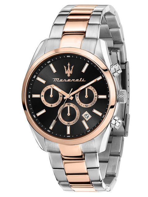 Zegarek Maserati R8853151002 to elegancki i nowoczesny zegarek męski. Na czarnej tarczy z różowo złotymi indeksami zabezpieczonej mineralnym szkłem znajdziemy datownik wskazujący dzień miesiąca oraz subtarcze będące wskazaniami chronografu i czasu dobowego.