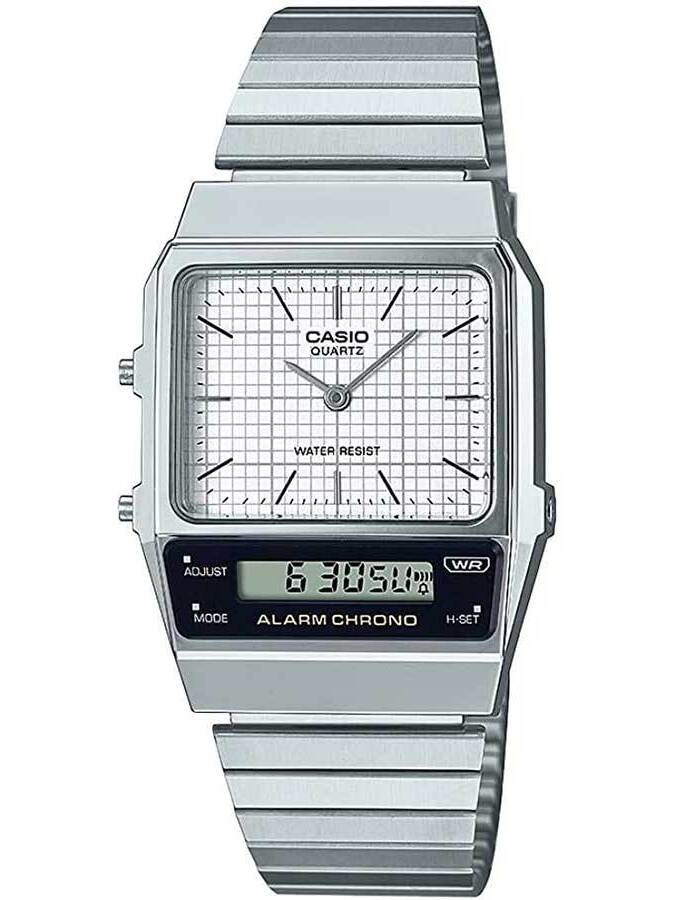 The Casio Vintage Dual Time AQ-800E-7A watch is a unique model that combines retro charm with modern functionality. Its classic silver-tone square envelope and silver-tone high-quality stainless steel bracelet give it a unique character that is sure to stand out from other watches. The subtle design with LCD display and easy-to-read numerals makes it an ideal choice for those who appreciate simplicity, but also want a practical everyday accessory to carry with them.
