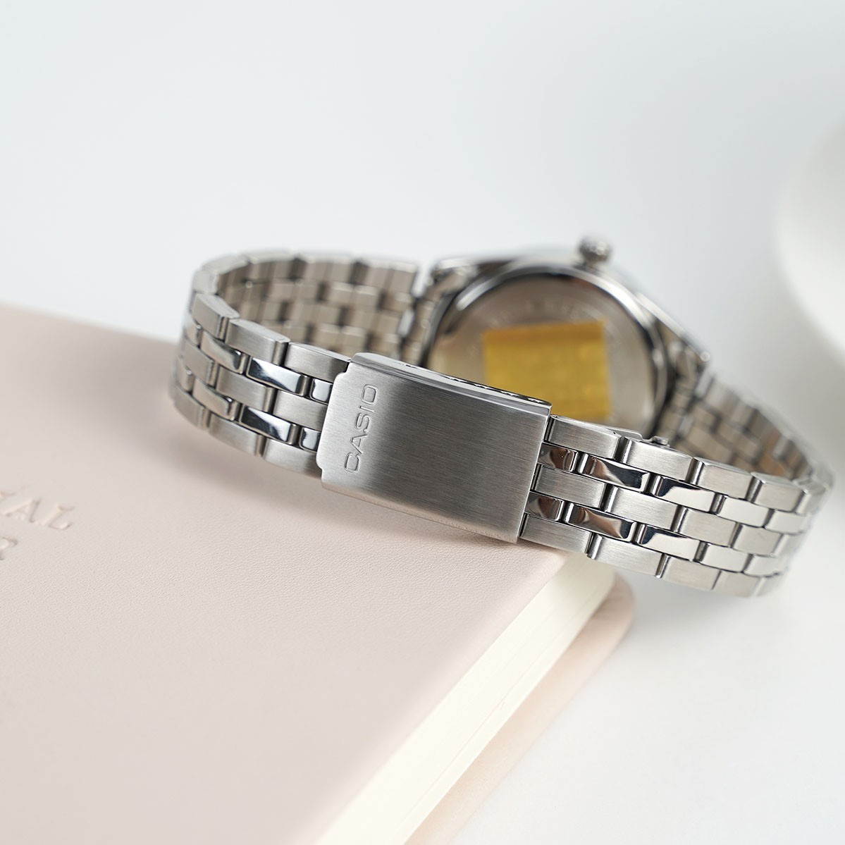 Casio Women's LTP-1335D-7A watch is a true combination of elegance, precision and timeless design that will delight any woman looking for both a stylish and functional accessory. This timepiece is more than a tool for measuring the hours - it is a subtle expression of femininity and refined taste. Its slender, silver-tone steel envelope exudes a delicate shine, blending perfectly with any outfit, be it casual or evening wear. A small, round dial with minimalist indexes and hands adds to its lightness, while emphasizing its versatile nature.