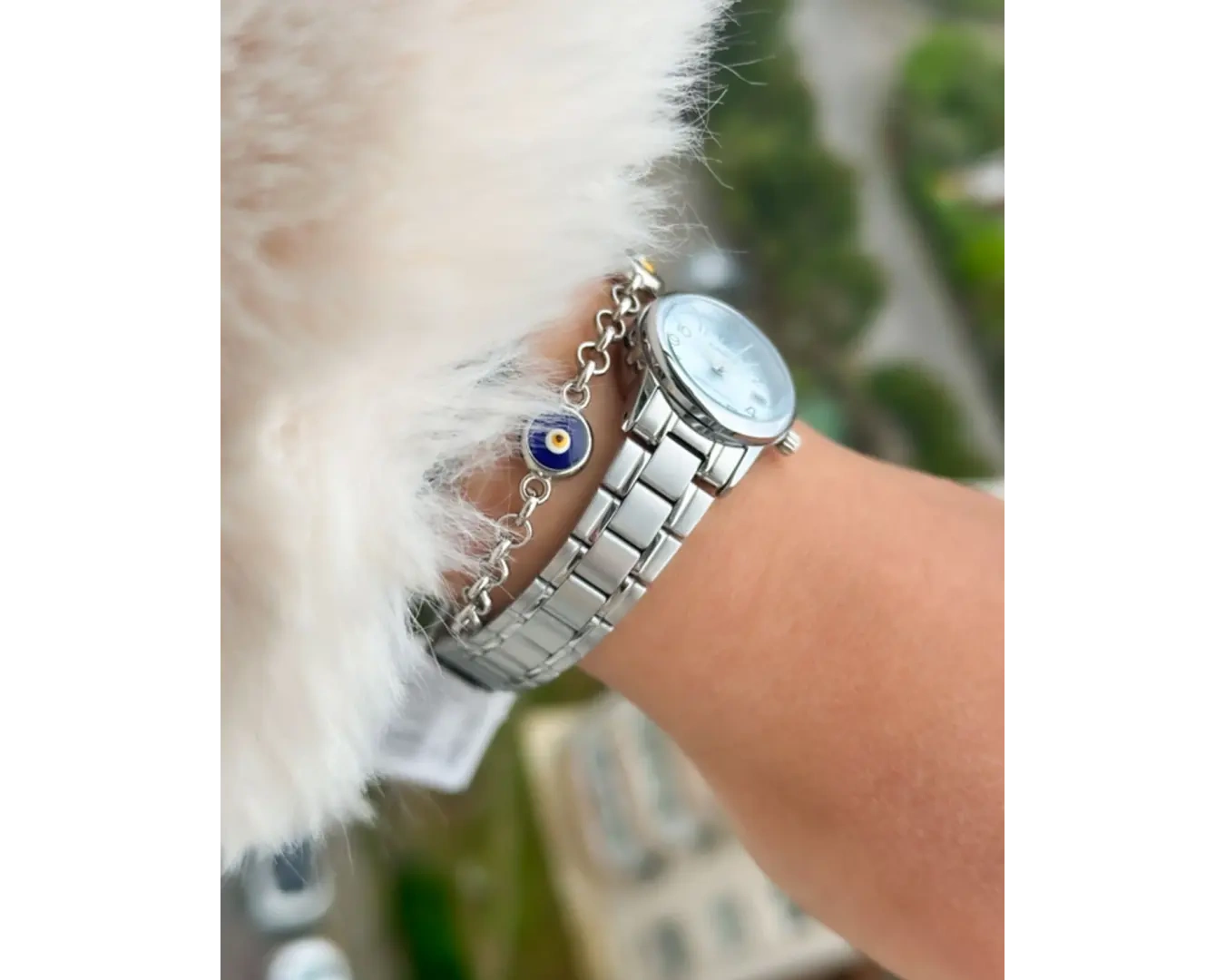 This model features an easy-to-read turquoise dial, which contrasts with the indexes and hands for convenient time reading. The watch has a date function, and its WR30 water resistance protects against accidental splashes, making it a practical choice for everyday use.