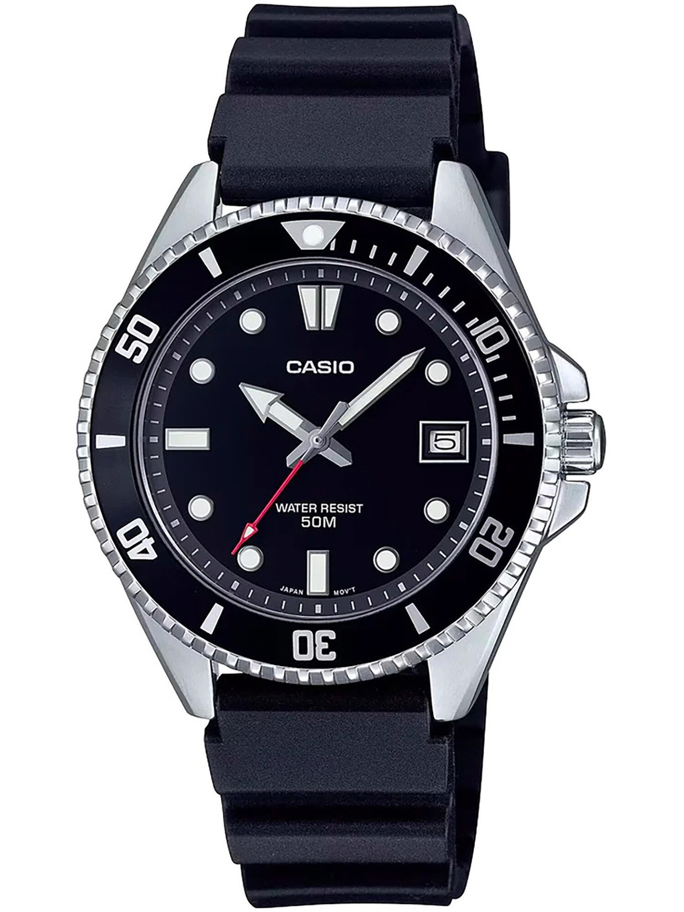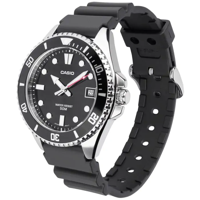 Zegarek Męski MDV-10-1A1VEF to stylowy model typu diver z serii sportowej marki Casio, idealny dla osób szukających połączenia funkcjonalności i estetyki. Koperta została wykonana z wytrzymałej stali nierdzewnej 316L, która jest odporna na działanie wody, potu oraz innych zewnętrznych czynników. Czarna tarcza, zabezpieczona mineralnym szkłem, jest odporna na zarysowania, zapewniając długotrwałą czytelność. Wbudowany datownik ułatwia śledzenie daty.