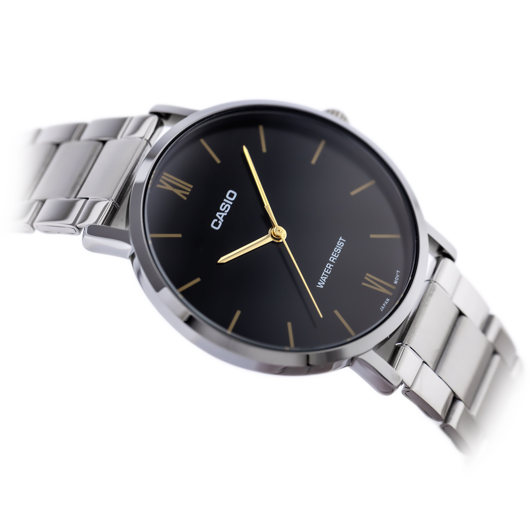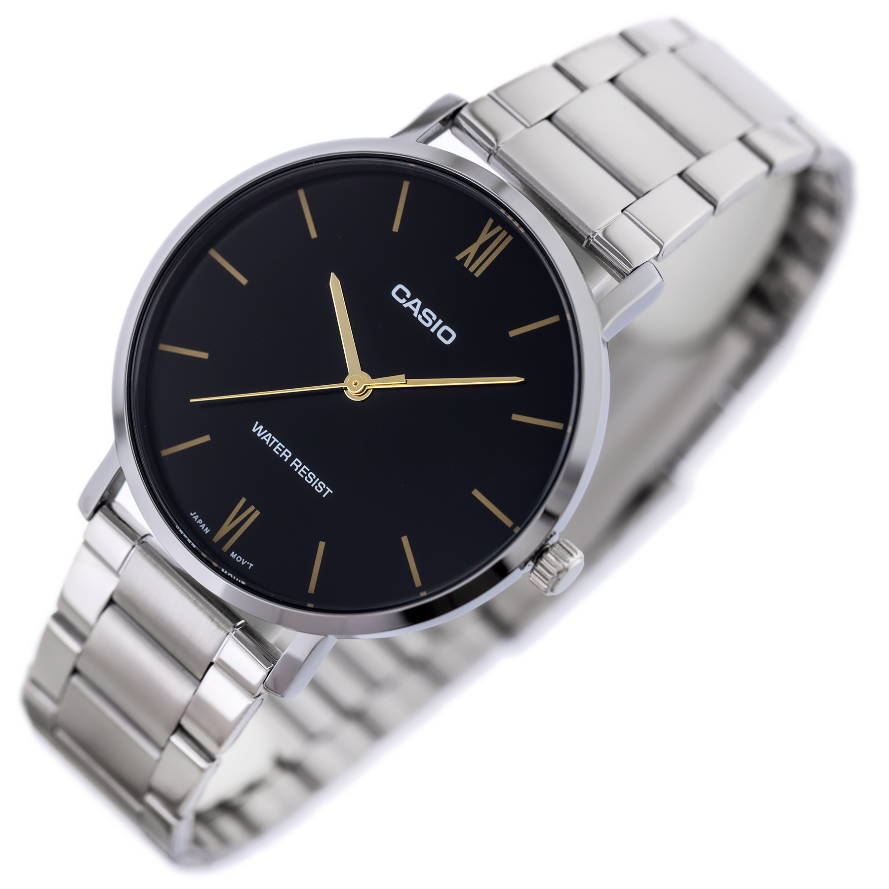 CASIO MTP-VT01D-1B men's watch is a combination of classic elegance and modern functionality that will make any man feel special. This model is a true tribute to minimalist design - its round black dial with subtle gold hands and indexes exudes calm and sophistication. The delicate silver envelope adds a touch of luxury, making it the perfect accessory for both a suit and casual outfits. This is a watch that not only shows the time, but also tells the story of your good taste.