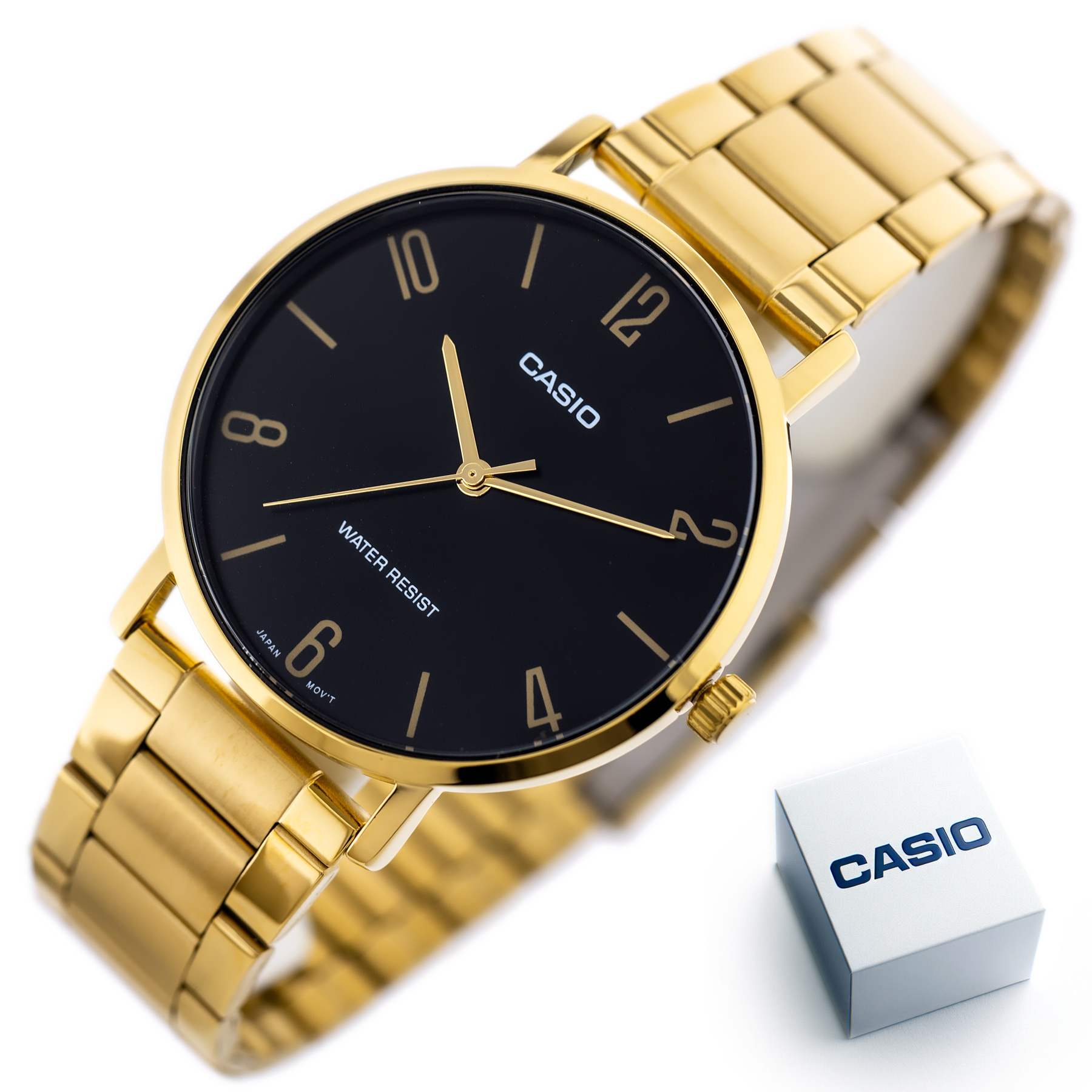 CASIO MTP-VT01G-1B2 is a watch that is perfect for a variety of situations - from office work to weekend outings. Its water resistance of up to 30M guarantees that it can handle splashes or brief immersion in water, making it a reliable everyday companion. The gold stainless steel bracelet, matched to the envelope, not only emphasizes the consistent design, but also ensures comfortable wearing thanks to a solid clasp that fits perfectly on the wrist.