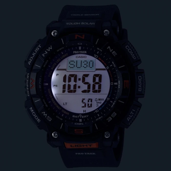 The Casio Pro Trek PRG-340-1ER men's watch is perfect for the modern and active man who expects more from a watch than just an accurate time display. This model is a veritable mine of functions, including backlighting: the possibility of manual or automatic backlighting of the digital display and hands, resistance to low temperatures (-10 °C), Neobrite backlighting, barometer (260/1100), thermometer (-10°C / +60°C), digital compass, altimeter up to 10,000 m, memory of altimeter measurements, world time, stopwatch - 1/100 sec. - 24h, timer - 1/1 min. - 1h, 5 daily alarms, automatic pointer correction, pointer movement functions, lock button, smart access technology, automatic calendar and 12-/24-hour format.