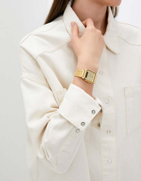 The watch is distinguished by a slim gold stainless steel envelope and a minimalist gold-colored dial with clear hands. The versatile design makes it suitable for both everyday and more formal outfits. The large, easy-to-read digital display with date display blends harmoniously with the analog hands, adding character and functionality to the watch.