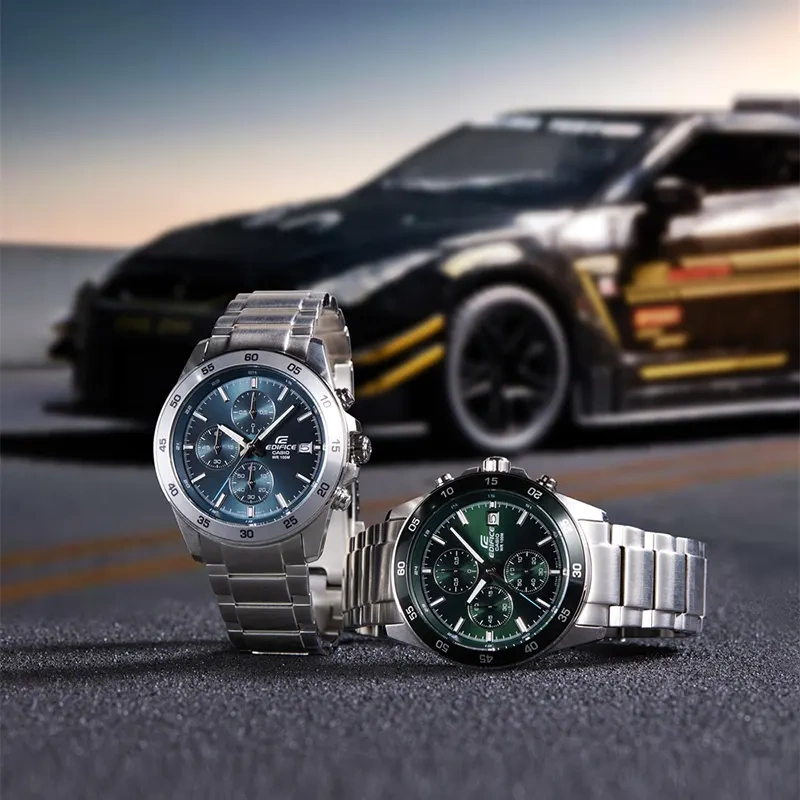 Zegarek CASIO Edifice- styl, funkcja i niezawodność w jednym zegarku. Elegancki i sportowy zarazem — model EFR-526D-3AV to propozycja dla mężczyzn, którzy cenią wyrafinowany wygląd i praktyczne rozwiązania. Koperta i bransoleta ze stali nierdzewnej nadają zegarkowi trwałości i klasy, a oryginalna tarcza w odcieniach szaro-zielonych przyciąga wzrok. Zegarek wyposażono w funkcję chronografu (stoper 1/10 s do 60 minut), datownik oraz luminescencyjne wskazówki, które gwarantują czytelność również po zmroku. Dzięki wodoszczelności na poziomie 100 metrów (10 bar) można go bez obaw nosić podczas pływania lub snorkelingu. Mechanizm kwarcowy zapewnia precyzyjne działanie, a wymiana baterii co około 2 lata nie sprawi problemu. Całość uzupełnia zakręcany dekiel i solidne zapięcie bransolety — detale, które świadczą o jakości.